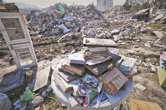 安塔基亚废墟中一张圆桌上堆满书本,一对夫妻的合照此时显得格外孤单 |