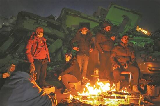当地时间2月14日,安塔基亚市灾区。寒冷的夜晚,受灾民众纷纷在路边生火取暖 |