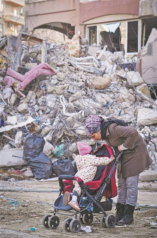 当地时间2月14日,安塔基亚市中心,一位母亲带着女儿走过满是废墟的街道 |