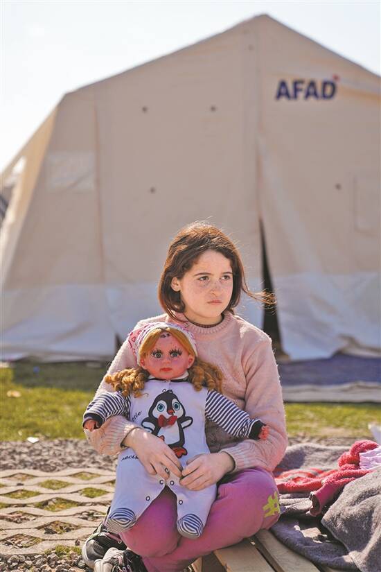 当地时间2月11日,安塔基亚市中心的一处公园,今年十岁的女孩Sana,坐在帐篷外抱着她的“小伙伴”,眼神中仍有余悸 |