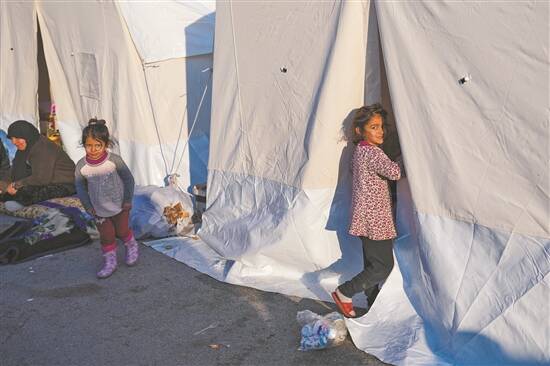 当地时间2月11日,安塔基亚,体育馆停车场改造的安置点,一个女孩在帐篷外回眸微笑 |
