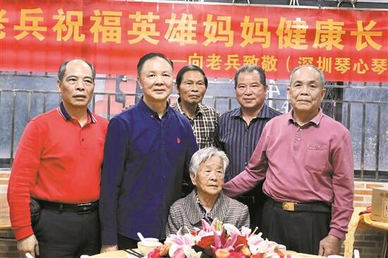 刘贤艺(后排中)和战友一起看望烈士母亲 受访者供图 |