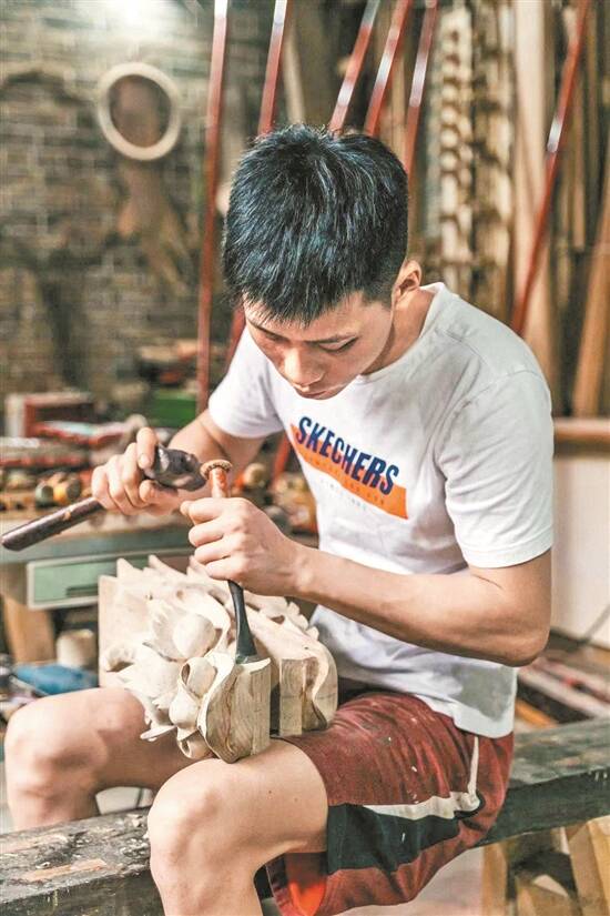 张伟潮在工作室雕刻龙头 受访者供图 |