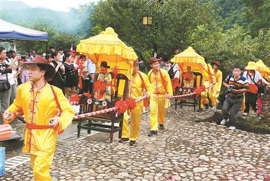身着盛装的轿夫抬起轿子,送“阿公”回村 |