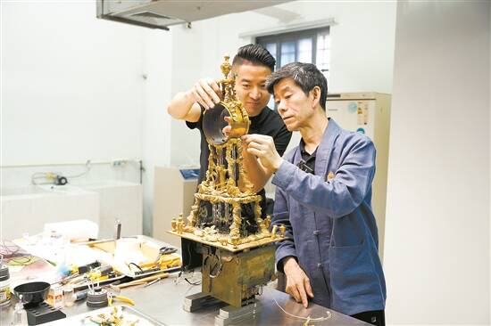 文物修复室里,王津(右)和徒弟亓昊楠(左)正在修复一件名为清铜鎏金转花水法奏乐钟的英国钟 |