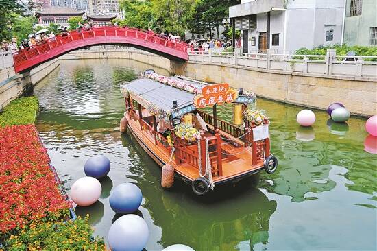 一艘花船在永庆坊荔枝湾河道缓缓前行 羊城晚报记者 陈秋明 摄 |