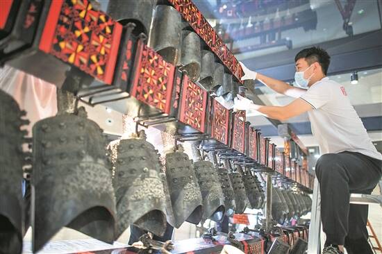 湖北省博物馆工作人员对曾侯乙编钟进行调试安装(资料图) 新华社发 |