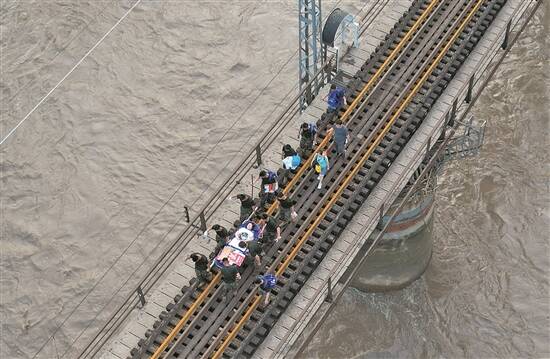 8月2日,受困列车旅客在救援人员帮助下徒步赶往转运客车(无人机照片) 新华社发 |