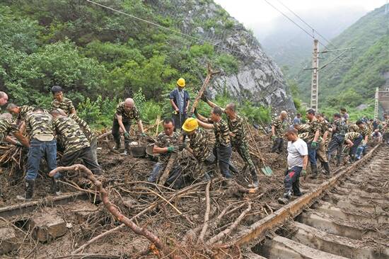 8月1日,在北京市门头沟区水峪嘴村附近一段被阻断的铁路线上,中铁六局工作人员在清理轨道上的杂物,全力恢复交通 新华社发 |