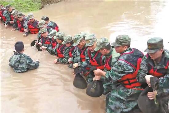 8月2日,中部战区空军某部官兵在北京市昌平区北沙河镇南侧搭设人墙并装填沙袋 新华社发 |