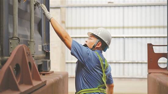 阿拉山口站货装车间换23线货运员谭磊正在给待发列车做安全检查(资料图) |