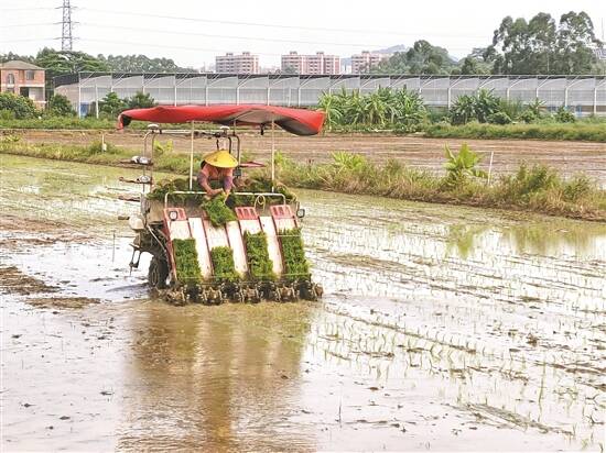在广州市增城区丝苗米产业园,农民正通过机械插秧 |