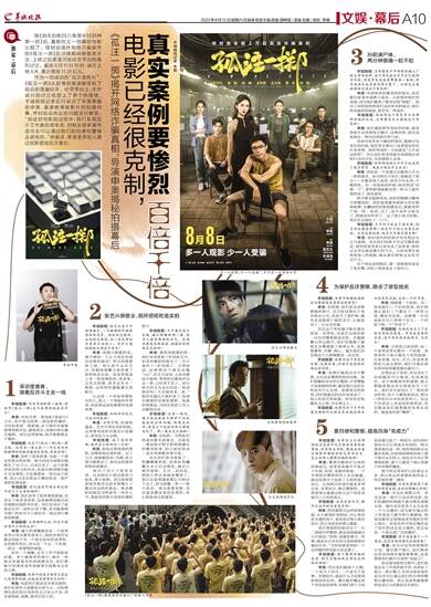 羊城晚报记者 李丽 继《消失的她》《八角笼中》《封神第一部》后,暑期档又一部爆款电影出现了。取材自境外网络诈骗案件的《孤注一掷》在点映期间便备受关注,上映之后更是引发社交平台的激烈讨论。截至8月11日16时,该片上映4天,累计票房11.31亿元。 作为一部成功的“反诈宣传片”,《孤注一掷》从剧情到表演都受到了观众的普遍好评。社交平台上,关于该片的讨论也登上了多个热搜榜。羊城晚报记者近日采访了导演兼编剧申奥,邀请他揭秘影片的拍摄内幕,并对观众热议的问题进行解答。“拍这部电影的过程中,我们发现反诈工作真的很辛苦,但其实很多案件是完全可以通过我们的自律和警惕去避免的。”申奥说,希望更多的人通过观影提高反诈意识。 采访受害者,跟着反诈斗士去一线 羊城晚报:作为导演和第一编剧,您创作《孤注一掷》这个故事的初衷是什么? 申奥:在拍完第一部电影《受益人》之后,我开始寻找第二部电影的题材。当时我看到一则新闻,有个境外诈骗集团绑架程序员、雇佣美女,向境内伸出魔爪骗钱。因为这则新闻,我开始想做这个题材。 羊城晚报:这成了《孤注一掷》的一条主线。还有另一条主线——阿天因为网络赌博和网络诈骗泥足深陷,有原型吗? 申奥:我听了很多故事,包括一个朋友的朋友的故事。他当初因为网络诈骗损失了50万元,后来自杀了。这个故事对我有很大的冲击,我意识到网络诈骗不光是要钱,它还能要命。因为这个故事,我正式决定把这个题材拍成一部严肃的犯罪电影。 羊城晚报:你们在创作剧本的过程中进行了大量的调研? 申奥:我们参考了很多调查新闻,也采访了很多受害者,包括被绑架最后成功逃脱回国的幸存者。我们还采访了奋战在反诈一线的公安干警,甚至跟着相关部门的反诈斗士到反诈一线去进行调查和抓捕。 羊城晚报:大量调研之后,对这个题材有什么新的认识? 申奥:最大的感触就是每一个受害者背后其实都有很多人,他的亲朋好友都会因此产生一个很长时间的连带伤。这些案件背后,其实是一个又一个家庭、一段又一段感情的崩盘。 还有一个感触,反诈工作开展起来好难。举个最简单的例子,境外一些地区连最基本的网络都没有,我们想象中的那些高科技破案手段根本无用武之地。 羊城晚报:电影中的很多场景已经让人觉得很残酷,比起真实的案例又如何? 申奥:电影的尺度还是非常克制的,我们在很多方面都是点到为止。实际案例比我们拍出来的有过之而无不及,甚至要黑暗、残酷、惨烈百倍千倍。 张艺兴很敬业,厕所捞纸吃是实拍 羊城晚报:张艺兴在片中扮演潘生,一个被骗到诈骗集团的程序员。他经历过虐待,也受到过诱惑,但一直没有放弃重获自由的心。为什么想到找他来演这个角色? 申奥:我刚开始想的是,能不能找一个让大家没有固定印象的演员?然后我就想到了他。我以前不认识艺兴,但跟他接触之前我看了他的很多访谈。我发现他身上有一股很辣的劲,很直率,又有点执拗,甚至还有点一根筋,这些特性都跟潘生很贴合。 让这样一个浑身带着阳光的人,投入一个黑暗的世界里,我觉得这是我想要的戏剧效果。 羊城晚报:如何评价张艺兴这次的表现? 申奥:非常自然、松弛和逼真。艺兴平常没戏的时候,会穿着戏里的衣服在片场溜达,甚至没人认出他。 羊城晚报:除了造型帮助,他是怎么做到这一点的? 申奥:我给过他海量的资料,没想到他会真的看。过了几天,他就跟我说:导演,我大部分都看过了,我有这样那样的构思和想法。 他自己设计了很多东西。比如他在片场会把背弓起来,脖子前倾。因为他观察到很多程序员面对屏幕久了都会有这样的姿态。他走路的时候还会特意有一些外八字,看起来四肢不是很协调的样子。 羊城晚报:片中潘生逃生失败、被打断腿的那一幕,很多人看得都倒吸凉气。这场戏看起来很逼真,拍摄时的情形是怎样的? 申奥:那场戏挺难拍的。我们本来准备了护具给艺兴,但是拍摄的时候出了一点小意外——护具掉了。正常来说,这种情况下演员会喊“cut”,但艺兴没说,大家也都没注意到,等到拍完整条冲过去一看,已经来不及了。我记得当时艺兴还在问我:“我表现好吗?不好就再来一条。”他甚至提出不要护具了,免得后期制作还要处理掉。他真的很敬业,当时在场的工作人员都很动容。 羊城晚报:还有一场戏,潘生把求救纸片撕碎了扔进肮脏的公用马桶,结果没水冲,情急之下他把碎纸片捞起来吃了。那一幕是怎么拍的? 申奥:实拍的。当然我们的道具都先消毒过。后面有一幕是阿才把手指伸到潘生的嘴里检查,拍之前孙阳也一直在用酒精消毒手指。 其实我们原本准备了一张翻糖做的纸,结果发现翻糖沾水之后会掉色,最后只能用真纸。艺兴二话没说,把纸片捞出来就放嘴里了,我们在监视器前都以为他吞下去了,拍完他嘴一张——纸片还在。观众看着很脏,其实道具都是染色处理的,所以看起来比较逼真。 孙阳演尸体,两分钟眼睛一眨不眨 羊城晚报:王传君在片中饰演诈骗工厂的主管陆经理,这个角色在社交平台引起很多讨论,网友开玩笑说请警察查一查他,因为他演反派实在演得太像了。当初怎么想到请他来演这个角色的? 申奥:传君和孙阳都是我的朋友,我好像比较喜欢请熟人演戏。大家喜欢他们的表演,因为他们做到了跟角色很“贴脸”。我自己也特别欣赏我们这次所