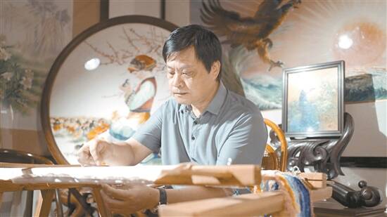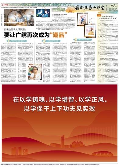 文/羊城晚报记者 周欣怡 朱绍杰 图/受访者提供(除署名外) “七夕”已然成为中国最具浪漫色彩的传统节日。实际上,与“七夕”相关的不只是爱情。七夕节又称“乞巧节”,这一天,民间最常见的习俗就是女孩们在晚上对着明月摆上时令瓜果,诚心拜祭,乞求心灵手巧,同时早遇良缘。 今年“七夕”前夕,广绣省级代表性传承人谭展鹏特别设计了一幅新作《月下穿针》,吸引了人们的关注。该作品一改传统广绣特色,以动漫画风展现出一名少女对着明月穿针乞巧的画面。少女身着一袭蓝衣,头戴凤形发簪,她的前方,一轮上弦月分外明亮。 这并不是谭展鹏第一次进行漫画风格的广绣创作。此前,他的漫画美少女系列广绣作品曾在2020年中国国际数码互动娱乐展览会(ChinaJoy)上轰动一时。 为此,记者走进了谭展鹏位于广州荔湾区芳村的工作室。 从自家开始抢救性保护 刚走进工作室,记者便被眼前鲜艳亮丽的色彩所吸引。墙面挂满了精美绝伦的绣品,画面中多为花鸟、动物、瓜果,从不同角度都可以看到绣品发出的柔和光泽。一幅绣有荔枝的作品中,网格状的果皮清晰可见,凹凸有致,浮雕般的立体质感似乎与“裸眼3D”无异。 “这已是陈老师不断改进后的第四代荔枝绣法了。”谭展鹏介绍。“陈老师”正是他的母亲——中国工艺美术大师、广绣国家级代表性传承人陈少芳。 “小时候家里面积很小,我们睡觉的床板就是母亲的工作台,我们经常看到母亲绣到深夜。”谭展鹏介绍,陈少芳1962年毕业于广州美术学院国画系,师从关山月、黎雄才、杨之光等岭南画派名师,有着扎实的绘画功底,毕业后便在广州市工艺美术研究所从事广绣设计。“除了广绣,母亲在玉雕、牙雕、木雕方面也有作品,但她觉得刺绣最适合将所学的国画技艺运用起来,所以选择了刺绣这一行。” 谭展鹏从小就随陈少芳学习绘画和广绣技艺,但在专注于广绣事业之前,他原本在航道局工作,但也从未停止创作。谭展鹏回忆,他的作品《鸿图大展》中表现的一只在海上迎着阳光展翅的大鹏,灵感就来自当时在船上的写生。2000年,因母亲年事渐高,谭展鹏毅然辞去工作,与妻子黄敏健一起全身心投入到广绣传承中。 谭展鹏记得,在二十世纪七八十年代,一大批手工艺人转行谋生。为了对广绣这门古老技艺进行抢救、保护与传承,陈少芳一家曾在家中开展了系统性、有针对性的创作。到1994年,陈少芳又在番禺成立广绣艺术研究所,重点研究、创作广绣精品,旨在将广绣最高技艺水准保留下来。被关山月誉为“广绣的世纪之作”的长卷《岭南锦绣》(长13.8米,宽1.2米),就是陈少芳在此期间完成的。这一作品为广绣重铸辉煌打造了一份实物范本。 如今谭展鹏将工作室落址于芳村一座不起眼的砖红色楼房二层,这里租金便宜,但工艺美术资源聚集。这间工作室见证了谭展鹏为广绣事业投入的情感与创新。 “三千花佬”写传奇 谭展鹏说,广绣在明代已是重要的民间手工艺之一。明正德九年(1514年),一个葡萄牙商人在广州购得龙袍绣片,回国献给国王,得到重赏,广绣的美名从此传遍欧洲。这说明“早在多年前,中国就拥有自己的奢侈品和潮品了”。 清代是广绣发展的鼎盛时期。广州、佛山等地绣坊、绣庄成行成市,仅广州就达50多家,分布在状元坊、新胜街、沙面一带。乾隆年间,广州更是出现了职业化的行会组织——“锦绣行”。1757年“一口通商”后,广州的外销丝织品市场更是繁荣。 随着海外市场的不断扩大,清代中期以后,一个有意思的现象出现了:那时的广绣多出自男子之手。他们被称为“花佬”。这显然与中国传统中“男耕女织”的传统观念并不相符。究其原因,或许是那时广绣订单量大,形成了一定的产业规模,供不应求,就需要工人加班加点地赶工。同时,广绣绣品中不乏大件,如窗帘、披肩等,需要工匠拿着长长的绣针站着完成绣制,他们经常一站便是一整天。因此种种,体力和耐力较女性高出一筹的男工便成为广绣行的主角。到了晚清时的广州,“三千花佬”的传奇故事便出现了。 在繁盛的对外贸易中,广绣逐渐形成了生活化、定制化、实用化的特点,不仅仅是架上“作品”,更是生活“产品”。其中,著名的“马尼拉披肩”见证了广绣在全球贸易史上的辉煌成绩。这是西班牙传统舞蹈弗拉门戈舞者标配的行头之一,上面精美的花鸟图案刺绣正源自广绣。这些具有东方元素的中国披肩深受欧洲上流社会女性喜爱,1772年前后,在欧洲的年销量多达8万余条。但由于当时销往西方的运输途中要经过菲律宾马尼拉港中转,这些广绣披肩又被称为“马尼拉披肩”。 谭展鹏说:“现在人们常常有一个观点,就是中国没有奢侈品。其实对海外受众来讲,广绣就是奢侈品。中国缺少的是奢侈品牌——即便‘马尼拉披肩’说明书上标明了‘产地:广东’,它仍被世界张冠李戴地叫了几百年。” “手有余温”的矛盾 谭展鹏对自己的定位其实是设计师。作为传承人,他认为传承的概念不仅是学会技法,还要通过设计,更好地展现广绣之美,更好地拥抱市场。这些年来,他一直在探索如何使广绣与当代生活产生连接,积极地在服装设计中融入广绣创作。 2005年,谭展鹏与服装品牌合作设计“广绣牛仔”系列服饰,通过广交会向全世界发布,刺绣成为当时的时尚标志。谭展鹏坦言,当时自己的任务很明确,就是把广绣精美的技法运用到