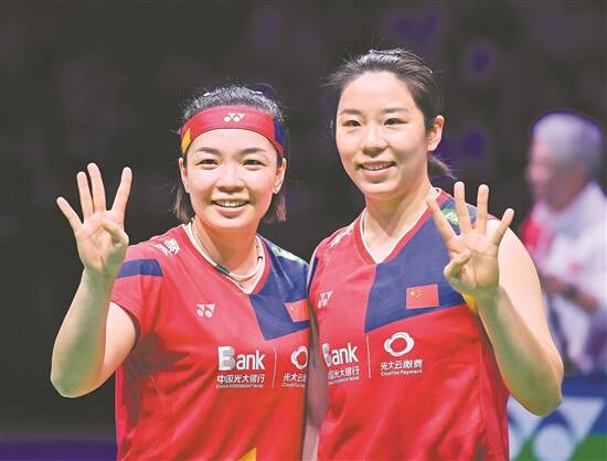 8月27日,在丹麦哥本哈根举行的2023年世界羽毛球锦标赛女双决赛中,中国组合陈清晨/贾一凡以2比0战胜印度尼西亚组合拉哈尤/西蒂,夺得冠军,为国羽夺得本届比赛唯一一枚金牌。“凡尘组合”成为历史上手握世锦赛金牌最多的女双组合(四冠),还史无前例地实现世锦赛三连冠! 图为陈清晨(左)/贾一凡在夺冠后庆祝 新华社发 详见A6