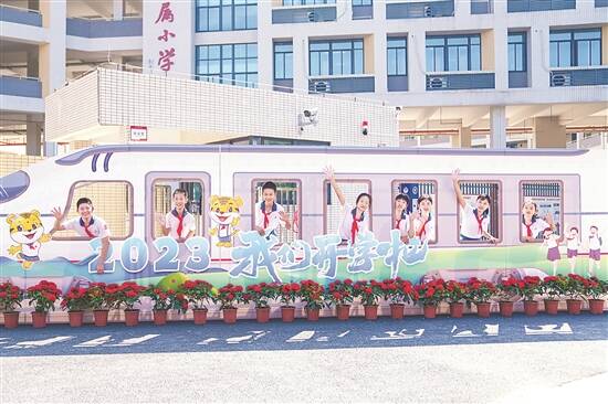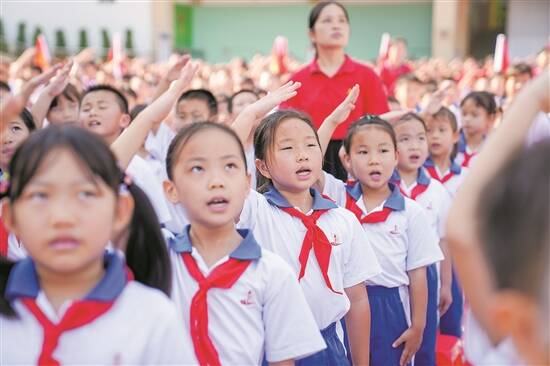 受台风影响,广州延迟开学的中小学于9月4日顺利开学。图为广州大学附属小学的学生们走进校园,参加开学典礼 羊城晚报记者 梁喻 摄 |