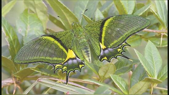 羊城晚报讯 记者李泽宇报道:近日,广东南岭国家级自然保护区科研团队在保护区海拔1600米以上的地方发现了金斑喙凤蝶新的栖息地,并拍摄了高清的珍贵影像。这是广东南岭国家级自然保护区首次拍摄到这么近距离、高清晰度的金斑喙凤蝶。 金斑喙凤蝶属蝶类凤蝶科喙凤属,一年一般只能繁殖两代,是中国唯一的蝶类国家一级重点保护野生动物,位列世界八大名贵蝴蝶之首,有“梦幻蝴蝶”“蝶中皇后”之美誉,野外生存数量非常稀少、极罕见,主要栖息在亚热带或热带海拔1000米左右的次原始森林中。 金斑喙凤蝶体长30毫米左右,翅展81-93毫米,是一种大型凤蝶。它的翅上鳞粉闪烁着幽幽绿光,前翅上各有一条弧形金绿色的斑带;后翅中央有几块金黄色的斑块,后缘有月牙形的金黄斑,后翅的尾状突出细长,末端一小截颜色金黄,因此得名金斑喙凤蝶。 金斑喙凤蝶通常在每年4月和8月进行繁殖。8月伊始,南岭保护区监测人员就开始在它们的分布区设置样线、进行持续观察,发现了两个点三只雄性金斑喙凤蝶,最终在5至10米的近距离拍到了珍贵的高清影像。据监测人员描述,当时在一片茂密的原生性中亚热带常绿阔叶林中,两只雄性金斑喙凤蝶正在为争夺领地而奋力打斗。