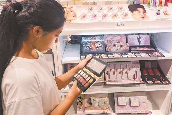 顾客在日本东京银座的一家商场查看中国彩妆品牌完美日记的眼影盘 新华社发 |