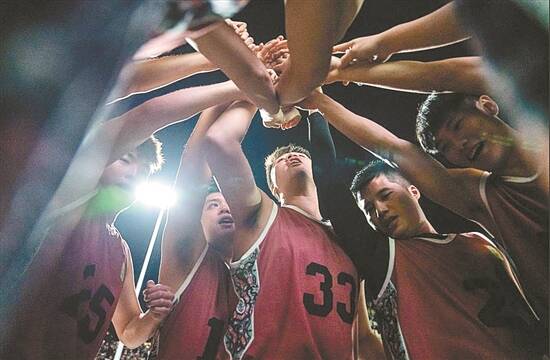 总决赛中广东沙溪队的队员们围圈呐喊 羊城晚报记者 钟振彬 摄 |