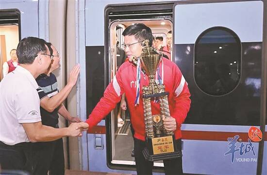 文/图 羊城晚报记者 张德钢 10月29日16时20分,随着从贵州方向驶来的高铁缓缓进入广州南站,刚斩获了首个全国“村BA”总决赛冠军的广东沙溪队载誉凯旋,沙溪镇党委书记徐成彬捧着冠军奖杯带领队员们走出列车,受到热情迎接,现场气氛热烈。 10月28日,全国和美乡村篮球大赛(“村BA”)总决赛在贵州打响,广东沙溪队面对东莞大朗队这支“劲敌”,在一度落后两位数的不利局势下最终逆转,夺得了来之不易的冠军。当晚,沙溪夺冠的消息传出,中山全城沸腾。 29日晚,在沙溪镇柏林酒店,家乡人已布置好场地迎接冠军队归来,而凯旋的沙溪队也带回了“村BA”的特色奖品“冠军银帽”。“太激动了,我们拉拉队18人跟随队员们出征这些天,嗓子都快喊哑了。”据拉拉队队员张伟东介绍,沙溪特别组织了阵容强大的拉拉队前去助阵,这些天他们一直用力为场上的运动员加油助威,“能够将冠军奖杯捧回,我们每个人都不虚此行”。