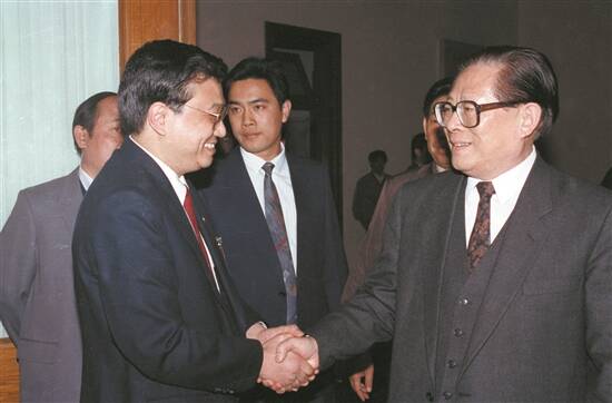 1993年5月3日下午,中国共产主义青年团第十三次全国代表大会在北京人民大会堂开幕。在5月3日上午的预备会议后,举行第一次主席团会议,推选李克强等同志为主席团常务主席。这是江泽民同志与李克强同志握手。 |