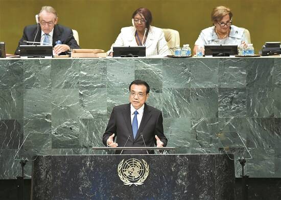 2016年9月21日,李克强同志在纽约联合国总部出席第71届联合国大会以“可持续发展目标:共同努力改造我们的世界”为主题的一般性辩论并发表题为《携手建设和平稳定可持续发展的世界》的讲话。 |