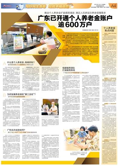 羊城晚报记者 周聪 通讯员 粤仁宣 个人养老金制度是多层次多支柱养老保险体系建设的重要内容。随着中国社会城镇化、人口老龄化、就业方式多样化加快发展,建立多层次、多支柱的养老保险体系的重要性逐渐凸显。 2022年,国务院办公厅印发《关于推动个人养老金发展的意见》,标志着个人养老金制度在我国正式落地。在人口老龄化挑战加剧、三支柱养老保障体系发展不充分不平衡的背景下,个人养老金承载着壮大第三支柱个人商业养老的厚重期待。 自个人养老金制度在36个先行城市(地区)正式实施以来,广东打出政策组合拳,印发《关于进一步促进我省养老保险第三支柱高质量发展的若干措施》《广东省个人养老金制度政策宣讲与推动行动工作方案》,推动个人养老金扩面提质增效,更好地满足人民群众多层次养老保障需求。据统计,广东先行地区(省直、广州、深圳)已开通个人养老金账户逾600万户。 什么是个人养老金,有啥好处? 政府政策支持、个人自愿参加、市场化运营 目前,我国多层次多支柱养老保险体系包括三个方面。基本养老保险、企业年金和职业年金以及个人储蓄性养老保险和商业养老保险。 三个支柱中,第一支柱是基本,也是主体,发挥着“保基本、兜底线”功能。第二、三支柱都是补充养老保险,是对第一支柱的有益补充。 个人养老金是指政府政策支持、个人自愿参加、市场化运营的补充养老保险制度。去年11月4日,人力资源和社会保障部、财政部等5部门联合发布《个人养老金实施办法》,标志着社会关注已久的个人养老金制度进入落地实施阶段。 《个人养老金实施办法》对个人养老金参加流程、资金账户管理、机构与产品管理、信息披露、监督管理等方面做出具体规定。具体而言,个人养老金政策呈现3个特点: ——政府政策支持。按照《实施办法》,个人养老金每年缴费上限为1.2万元,并按照国家有关规定享受税收优惠政策。人社部、财政部未来将根据经济社会发展水平和养老保险体系发展情况等因素适时调整缴费上限。 值得注意的是,财政部、国家税务总局发布的《关于个人养老金有关个人所得税政策的公告》提出,对个人养老金实施递延纳税优惠政策。对缴费者按每年1.2万元的限额予以税前扣除,投资收益暂不征税,领取收入的实际税负降为3%。 个税优惠将引导和鼓励人们参与申办个人养老金,增强自我保障意识。特别是领取收入的实际税负由原来的7.5%降为3%,国家用“真金白银”提高了群众的受惠程度。 ——个人自愿参加。《实施办法》提出,个人养老金的参加人应当是在中国境内参加城镇职工基本养老保险或者城乡居民基本养老保险的劳动者。这意味着,这些参保居民都可以自愿申办个人养老金,且不受就业形态、地域、户籍限制。 根据《实施办法》,个人养老金实行个人账户制,参加人的个人缴费全部归集到个人资金账户,完全积累。达到领取个人养老金年龄等条件后,可以自己决定是按月还是分次或者一次性领取,转入本人社会保障卡银行账户自由支配使用。 ——市场化运营。《实施办法》提出,参加人自主选择购买符合规定的金融产品。个人养老金产品应当具备运作安全、成熟稳定、标的规范、侧重长期保值等基本特征。个人养老金产品销售机构要以“销售适当性”为原则,不得主动向参加人推介超出其风险承受能力的个人养老金产品。 为何发展养老保险“第三支柱”? 老年生活更有品质更有保障 1991年,国务院下发《关于企业职工养老保险制度改革的决定》,提出建立起基本养老保险与企业补充养老保险和职工个人储蓄性养老保险相结合的制度,实行国家、企业、个人三方共同负担。 数十年来,中国不断创新体制机制,逐步完善多层次、多支柱的养老保险体系。 养老保险第三支柱,有利于应对人口老龄化,构建功能更加完备的养老保险体系。推动养老保险第三支柱高质量发展能满足人民群众多层次、多样化养老保障需求,使退休人员在基本养老保险和企业年金、职业年金基础上再增加一份积累,进一步提高退休待遇水平,让老年生活更有保障、更有质量。 那么目前,个人养老金制度试点以来情况如何?据悉,自去年11月个人养老金制度在36个先行城市(地区)正式实施以来,个人养老金参加人数持续增加。个人养老金制度的落地进一步推动中国居民养老意识发展。 人力资源和社会保障部数据显示,截至今年6月底,全国36个先行城市(地区)开立个人养老金账户人数达4030万人。富达基金联合中信银行和华夏基金近日发布的2023年《中国居民养老财富管理发展报告》显示,个人养老金制度启动实施一年来,中国居民对于个人养老金制度以及养老财富规划的认识有所提升,近七成(68%)受访者表示对个人养老金制度有所了解,已经有养老财富规划的人群占比相较上年也上升了5个百分点。 记者注意到,个人养老金“货架”上的产品也在不断扩容,进一步满足参与人差异化养老投资需求。《实施办法》明确,个人养老金实行个人账户制,市民自主选择购买符合规定的储蓄存款、理财产品、商业养老保险、公募基金等金融产品。截至今年10月底,个人养老金产品合计739只,含465款存款产品、162只基金产品、93款保险产品、19款理财产品。据业内人士透露,目前各类金融产品运作安全、成熟稳定、标的规范、侧重长期保