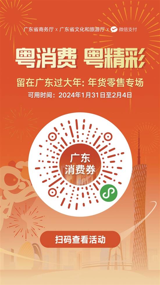 羊城晚报讯 记者孙绮曼报道:腊月已至,年味渐浓,留在广东过大年! 1月28日,广东“粤消费 粤精彩”消费券“留在广东过大年”年货零售专场启动预约报名,助力消费者购置年货,喜迎甲辰龙年到来。此次消费券仍采用“预约报名,在线开奖”方式进行,消费券满减折扣可达七折,保留888元“迎春券”惊喜大礼,让朋友们欢欢喜喜留在广东过大年! 保留888元迎春好礼 此次活动主要发放年货零售专场消费券,券面额统一为:满50元减15元、满100元减30元、满200元减60元、满400元减120元,相当于直接打七折! 同时,之前重磅升级的满888.01元减888元“迎春券”继续保留,助力消费者购置年货。 1月31日开奖发券 此次活动采用“预约报名,在线开奖”的方式进行,设备实时地理位置定位在广东省且已开通微信支付实名认证账户的消费者均可参与。 公众在微信搜索“广东消费券”小程序点击“订阅通知”或“立即报名”可参与活动,或通过“广东商务”“广东文旅”微信公众号,点击相关链接也可参与活动。 之前已报名参加过“粤消费 粤精彩”文旅专场活动的消费者将自动进入“年货零售专场”预约报名,无需再手动预约。 活动报名时间:2024年1月28日12:00—1月29日23:59:59,开奖时间:2024年1月31日7:00,消费券有效期:2024年1月31日7:00—2024年2月4日23:59:59。公众可在“广东消费券”微信小程序查询中签结果。 适用门店一键可查 消费者可通过“广东消费券”微信小程序,点击“全省21市可用商户名录”或“品牌小程序可用名录”,搜索、查看参与此次活动的所有商户,门店列表上线了按照距离排序展示能力,极大提升消费者核销效率。持有消费券的消费者,在参与活动的商户处消费时使用微信支付,消费券可自动核销,享受满减优惠。 消费者可以通过“广东消费券”小程序,或关注“广东商务”“广东文旅”微信公众号了解更多活动详情。