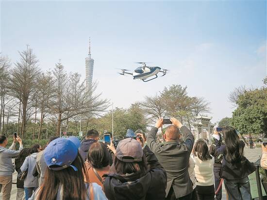3月8日,小鹏“飞行汽车”从天德广场升空,向广州塔方向飞行,现场观众纷纷拿起手机记录 羊城晚报记者 蔡嘉鸿 摄