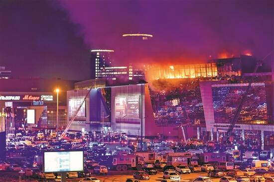 3月22日,俄罗斯莫斯科近郊克拉斯诺戈尔斯克市一音乐厅发生枪击事件后引发火灾 新华社发 |