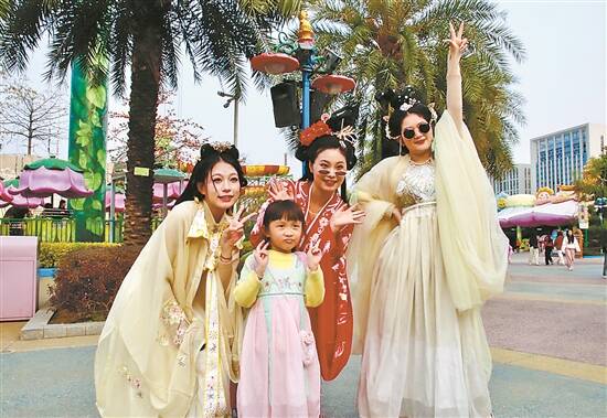 广州融创乐园里,穿着汉服的游客与模特拍照 |