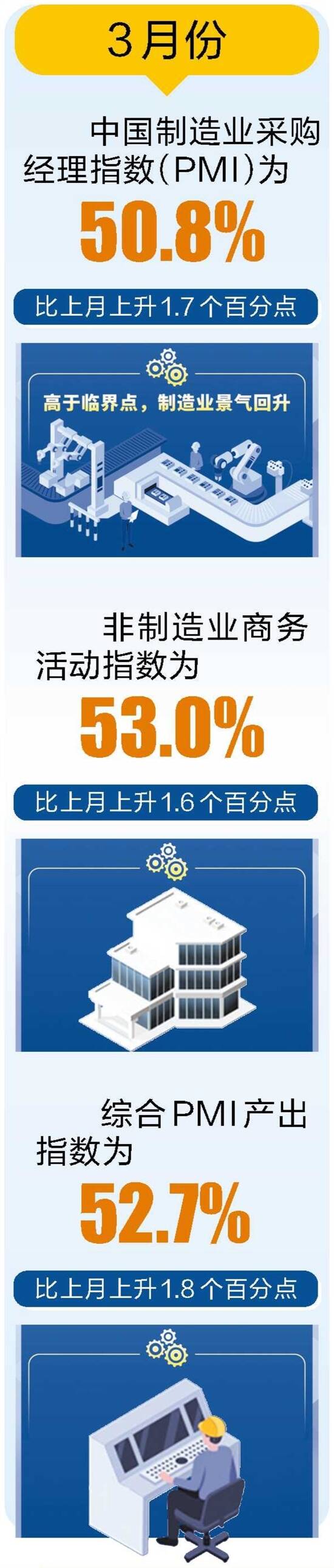国家统计局服务业调查中心、中国物流与采购联合会3月31日发布数据,3月份,中国制造业采购经理指数(PMI)、非制造业商务活动指数和综合PMI产出指数分别为50.8%、53.0%和52.7%,比上月上升1.7、1.6和1.8个百分点,三大指数均位于扩张区间,企业生产经营活动加快,我国经济景气水平回升。 业内人士分析指出,作为经济运行先行指标,3月份三大指数同步回升,显示我国经济运行延续回升向好态势,内生动力持续增强,社会预期不断改善,高质量发展扎实推进。 国家统计局服务业调查中心高级统计师赵庆河表示,3月份,随着企业在春节过后加快复工复产,市场活跃度提升,制造业PMI重返扩张区间。在调查的21个行业中有15个位于扩张区间,比上月增加10个,制造业景气面明显扩大。 ——产需指数双双回升,进出口指数重返扩张区间。 “3月份,随着稳经济扩内需稳外贸政策持续发力,经济内生动力不断释放,同时外部需求也有所改善,市场需求增长较好。”中国物流信息中心专家文韬说。 统计数据显示,3月份,新订单指数为53.0%,较上月上升4.0个百分点;新出口订单指数为51.3%,较上月上升5.0个百分点,在连续11个月运行在50%以下后重返扩张区间。 文韬表示,3月份,春节假期影响消退,天气逐步回暖,企业和工地全面开工复工,需求增长带动企业生产意愿上升。生产指数为52.2%,较上月上升2.4个百分点。 ——三大重点行业同步扩张,小型企业PMI升至扩张区间。 3月份,高技术制造业、消费品行业、装备制造业PMI分别为53.9%、51.8%和51.6%,比上月上升3.1、1.8和2.1个百分点,其中高技术制造业生产指数和新订单指数均高于55.0%,相关行业产需加快释放。 不同规模企业生产经营状况均有所改善。3月份,大、中、小型企业PMI分别为51.1%、50.6%和50.3%,比上月上升0.7、1.5和3.9个百分点。其中,小型企业PMI12个月以来首次升至扩张区间,生产经营活动有所加快。 ——市场预期继续向好,企业发展信心增强。 3月份,生产经营活动预期指数为55.6%,比上月上升1.4个百分点,升至较高景气区间,表明企业对近期市场发展信心增强。 “从最新月度数据看,汽车销量保持增长态势。继上海、北京、杭州、深圳后,我们在广州城区开通点到点领航辅助服务(PPA)。”极越首席执行官夏一平说,中国有丰富应用场景、大量高素质人才和完备产业供给体系,发展智能网联新能源汽车前景广阔。 不过,赵庆河也表示,调查结果显示,企业生产经营中仍面临一些突出问题,比如反映行业竞争加剧、市场需求不足的企业比重仍然较高。当前推动新一轮大规模设备更新和消费品以旧换新等政策措施还需进一步细化落实,为制造业高质量发展提供有力支撑。 从非制造业情况看,3月份,非制造业商务活动指数为53.0%,比上月上升1.6个百分点,非制造业景气水平持续回升。 服务业回升向好。3月份,服务业商务活动指数为52.4%,比上月上升1.4个百分点,连续3个月回升。从市场预期看,业务活动预期指数为58.2%,比上月上升0.1个百分点,持续位于较高景气区间。 建筑业扩张加快。赵庆河说,随着气候转暖和节后集中开工,各地建筑工程施工进度加快,建筑业商务活动指数为56.2%,比上月上升2.7个百分点,建筑业总体扩张加快。 “3月份,综合PMI产出指数为52.7%,比上月上升1.8个百分点,表明我国企业生产经营活动扩张加快。”赵庆河说。 (新华社)