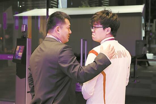 2023年10月3日,浙江杭州,杭州亚运会围棋男团决赛,中国不敌韩国获得银牌。赛后,常昊安慰柯洁 图/视觉中国 |