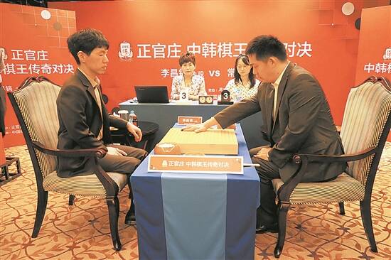 2016年8月12日,上海,正官庄中韩棋王传奇对决赛上,常昊(右)和李昌镐对垒 图/视觉中国 |