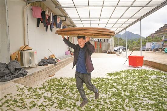 李烁利用簸箕浪青,促进茶叶相互摩擦后发酵,这一过程对茶叶形成色、香、味至关重要 |