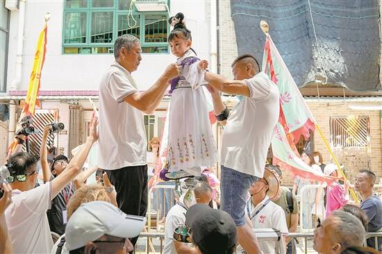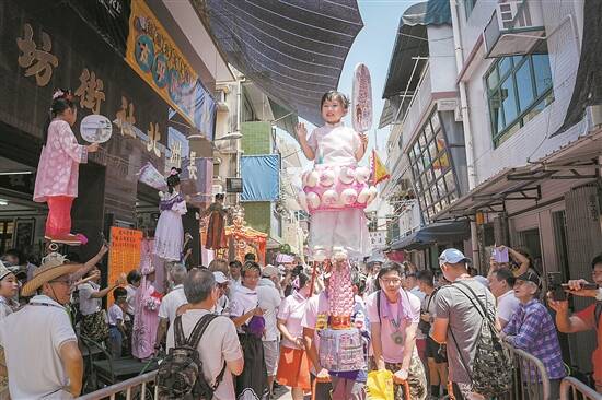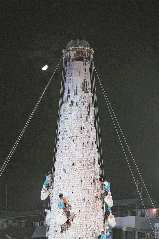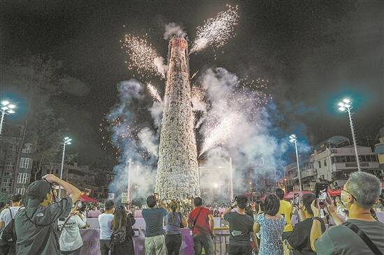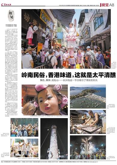 图/羊城晚报记者 蔡嘉鸿 文/羊城晚报记者 王漫琪 5月15日,农历四月初八“佛诞日”。到了这一天,持续数日的“太平清醮”系列民俗活动的节日气氛在香港长洲岛上推至高潮。 长洲太平清醮,是香港独有的民俗活动,于每年农历四月初五至初九举行。2011年被列入第三批国家级非物质文化遗产名录,更被评选为“全球十大古怪节日”之一。相传清代晚期,长洲曾有瘟疫肆虐,岛民为求消灾解厄,向北帝拜祭祈福,并奉北帝神像在街上巡游,果然使瘟疫平息。自此之后,岛民每年都会举办太平清醮,酬谢北帝神恩,以祈佑长洲平安。 下午1时半,长洲岛上阳光明媚,海风习习。随着喧天的锣鼓声,长洲太平清醮的重头戏“飘色会景巡游”活动开始了。来自长洲岛内外的多支社团巡游队伍从北帝庙游乐场出发,穿街走巷。数名壮汉扛着硕大的标旗在前开道,雄迈威武的舞麒麟、舞狮,甚至还有奇趣的喷水舞象,引得夹道观赏的观众们争相按下快门;身穿各式主题服饰扮成古代神话人物、动漫角色、爱国爱港的现任官员等的小童,站在约2米高的铁支架上“凌空飘起”,被锣鼓队、仪仗队护送在巡游队伍中间,频频与市民游客挥手互动。 街道的两旁,许多商铺在售卖长洲当地特色的平安包,吸引了众多市民和游客排长龙驻足购买。北帝庙前的醮场中,三座“包山”挂满了实体平安包供品,成为游客们的打卡点。 备受期待的“抢包山”比赛,则是长洲太平清醮的压轴节目。16日凌晨零时整,“抢包山”个人赛决赛在全场上千观众的倒数欢呼声中鸣锣开赛——12名经层层选拔脱颖而出的选手(9男3女),奋勇向14.42米高、悬挂9000个仿真包子的包山架攀爬,争夺包山顶部不同区域不同分值的“平安包”,参赛者必须在限时3分钟内摘取尽可能高的分数并及时落地。最终,个人赛男子组、女子组分别由叶建文和龚子珊夺得“包山王”与“包山后”的桂冠。 在随后举行的“抢包山接力邀请赛”中,主办方邀请了三队来自深圳、珠海及澳门等粤港澳大湾区城市的攀爬好手,与七支长洲本地团体一决高下,深圳市登山户外运动协会队揽得冠军。 漫天焰火喷薄绽放,抢包山等活动在夜色中圆满落幕。 乘船尽兴而归的游人们,带走白天的欢乐与对平安的祈盼。