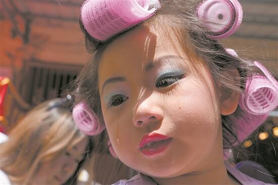 扮演飘色演员的小孩平均年龄4-7岁,在酷暑中巡游,不少小朋友边流眼泪边坚持表演 |