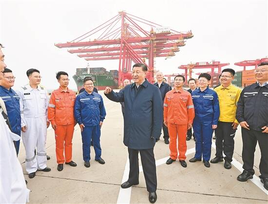 5月22日至24日,中共中央总书记、国家主席、中央军委主席习近平在山东考察。这是22日下午,习近平在日照港亲切慰问港口科技工作者、运营人员、航运人员 新华社发 |