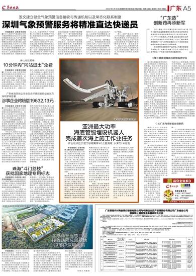 羊城晚报讯 记者余胜容、通讯员湛宣摄影报道:近日,国内首台全自主研制、全国产化供应链、亚洲最大功率海底管缆埋设机器人完成了首次海上施工作业任务。据了解,此次海上施工作业的地点,位于湛江徐