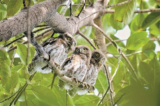 羊城晚报讯 记者陈秋明摄影报道:5月29日,在广州市流花湖公园,一棵古老的大榕树上,有街坊发现3只猫头鹰小萌宝挤在树枝上“排排坐”,或相互梳理羽毛,或张望四周,好奇地观察着周围的环境,十分可爱。 它们的出现很快吸引了众多街坊和摄影发烧友的关注,街坊们纷纷停下脚步,拿出手机、相机记录下这温馨的场景。 有经常在公园拍鸟的摄影爱好者兴奋地告诉记者,附近树枝上有猫头鹰妈妈的窝,他已经跟拍了两个多月了,“小萌宝们这几天出巢,想不到一出来就是3只,去年也是在这附近看见有猫头鹰宝宝出生,广州现在的生态环境真是太好了”。 “拍到了、拍到了,还是一次拍3只呢!”从佛山赶来拍摄的陈叔告诉记者,这猫头鹰是斑头鸺鹠。 据了解,斑头鸺鹠是中国国家二级重点保护野生动物,主要以昆虫和鼠类为食,中国分布于华南、华中、西南及东南等地,以树洞或崖壁洞穴为巢。繁殖期为5-7月,1年繁殖1-2窝,每窝产卵3-5枚,孵化期为28-29天。 广州的生态环境越来越好,流花湖猫头鹰家族成为一个亮点,它们以自己的方式,让街坊们感受到自然界的和谐与奇妙。