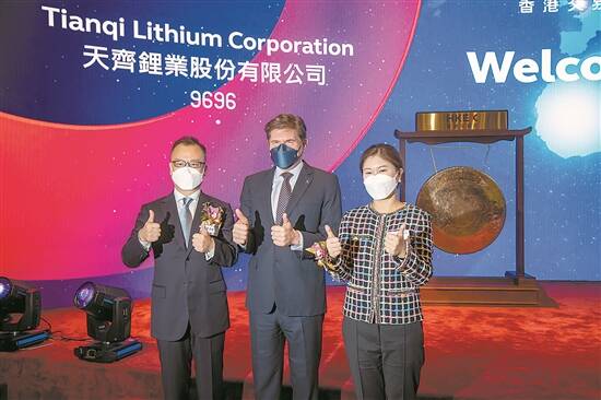 2022年7月13日,天齐锂业在港股上市,右一为蒋安琪 图/视觉中国 |