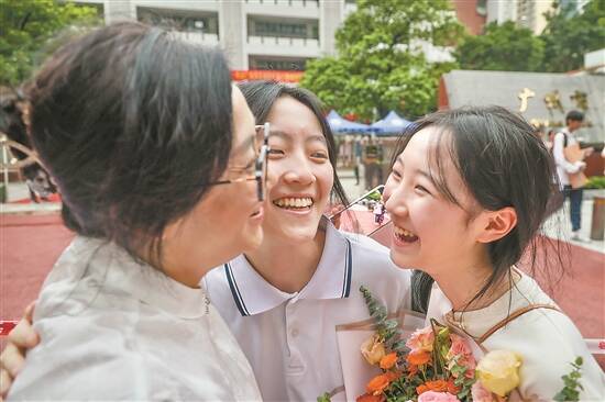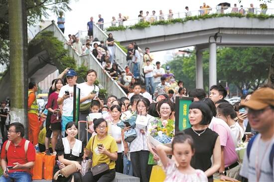 统筹/羊城晚报记者 陈亮 文/羊城晚报记者 陈亮 崔文灿 何宁 孙唯 王沫依 秦小杰 朱嘉乐 实习生 刘雅萱 罗钰涵 龙名扬 陈艺铭 张梓欣 王樱淋 6月9日,为期3天的高考落下帷幕,考生们带着自信和期待走出考场,迎接他们的是家人的热烈拥抱和同学朋友的深情“应援”。不少家长“花式迎接”,亲友团助阵气势高涨,他们用特有的“仪式感”,给考生提供正向的情绪价值,让他们留下难忘的记忆。 “985”红包与“9.85”向日葵受热捧 广东广雅中学考点外,游同学走出考场后收到了父母送上的“985红包”,喜庆的红色“利是封”里装着崭新的985元人民币,带着“考上985大学”的美好祝福。游同学的妈妈谭女士还带上了女儿抱了18年的巧虎来迎接女儿。谭女士表示,女儿从几个月大就喜欢抱着巧虎公仔睡觉,直到现在也要抱着睡,巧虎就像亲人一样一直陪伴着女儿成长。 记者留意到,今年多个考点外的“高考文创产品”均以“985”这一数字做文章。天河中学的郑同学姐妹俩一同上“战场”,高考结束后她们也收到父母赠送的“985”红包,姐姐志在“北师大”,妹妹则豪言上“清北”。此外,售价9.85元的手工向日葵因寓意“考上985”和“一举夺魁”也受到家长们的青睐。 华南师范大学附属中学陈同学的弟弟身穿状元服,拿着橙子和绣球花为哥哥加油:“祝哥哥金榜题名!”陈同学妈妈介绍道,“橙子代表心想事成,绣球花代表锦绣前程!”华附龙同学的妹妹抱着鲜花在场外等待,她稚嫩地说道:“哥哥考试要拿100分,考上北大!” 创意立牌为“显眼包”送上“惊喜” 除了收获家人的关爱,不少考生还得到了朋友、学弟学妹的特别“应援”。执信中学辩论队队员手持DIY的牌子,上面写着“欢迎回家”“一举夺魁”等祝福语,为学长们送上鼓励和祝福。 在六中考点外,有父母手持横幅,上面写着“首席大提琴手,高考算什么,姐拿下了。十二年教育优秀传承者”“完美收官,前程似锦,畅快追梦。考地理的时候想好去哪里没有”。看到眼前的“阵仗”(场面),考生陈婉珉喜悦中带着一丝冷静,她说早就猜到了爸爸妈妈的“惊喜”举动,“谢谢他们,谢谢我的后援团们,现在最想去吃饭睡觉”。 考生马嘉洋的朋友们早早准备了人形立牌和标语,上面有他不同时期的照片,“希望他看到会喜欢,他开不开心不知道,反正我们很开心”。现场还有一帮少男少女举着印有朱同学照片的海报,上面写着“朱大小姐,您高考辛苦了”“美貌与生俱来”。 天河中学考点外,去年参加完高考的小张,正在等候今年参加高考的妹妹,她特意制作了一张大立牌海报为妹妹助威,称呼妹妹是“货真价实优秀本秀”“从小美到大”,还说“要将妹妹上交给国家啦”。 广州家长特备靓汤与千层糕 在执信中学考点外,有一位家长手持一壶老广特色、热气腾腾的靓汤,她说:“这是我特意为孩子熬制的,希望她能在高考后好好补补身体,也为她即将开始的新生活加油打气。” 另一位母亲手持一盒千层糕,为走出考场的考生们送上祝福。她表示,千层糕寓意步步高升,希望每一位高三学子顺利考上心仪大学,未来能一帆风顺。 铁一中学越秀校区考点外成为花的海洋,家长们手捧鲜花为孩子们送上祝福。有家长手举两朵向日葵,有家长送上了一束用《兰亭序》的书法包装起的鲜花,尽显文化气息。铁一中学的汤同学直言最想感谢妈妈,原来在高考前十天,汤同学先后经历了甲流和细菌性感染,“我当时以为无法参加高考了,是妈妈一直陪伴我鼓励我,让我坚持了下来。” 9日下午,距离生物考试结束半个小时左右,南方医科大学南方医院创伤骨科主任医师陈滨和妻子出现在广州市第七中学考场外。今年,陈滨的儿子参加高考,夫妻俩特意前来,为孩子加油打气。陈滨告诉记者,自己是医生,家住医院附近,身边朋友也多是医生,耳濡目染下,儿子也有着学医的憧憬。作为骨科医生,平日多接触运动类项目的研究,他留意到,儿子也对这方面产生了兴趣。1991年,陈滨参加高考,考入南医大,33年后儿子的目标也是南医大。 今年在七中考点,来自广州市财经商贸职业学校的学生显得有些特殊——作为中职生群体参加夏季高考,属于“小众”群体。回顾中职三年,他们不禁落泪。几位学生提到,在中职高考班学习,学习资源虽不及普通高中,但老师们都尽全力帮助他们,班主任三年里数次累倒。一位学生说:“三年前,我刚进入中职有些迷茫,但现在的我们,走在新的道路上。” 相关报道见A3