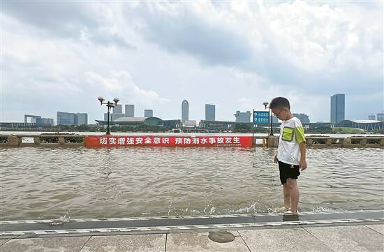 羊城晚报讯 记者梁怿韬摄影报道:根据水文部门的预计,受上游洪水叠加天文大潮影响,珠江广州河段22日将出现本轮西江和北江洪水过程以来最高潮位。记者当天在广州市区看到,超高的江水漫过江边护栏,有亲水平台被江水漫过。个别市民进入亲水平台戏水,有江岸巡查人员在现场留意市民的戏水行为。 记者22日中午在天河区临江大道员村亲水平台看到,处于高潮中的江水漫过江边护栏,直抵亲水平台底层,从高处看亲水平台的底层已经和护栏外的珠江“融为一体”。当珠江上有船驶过,波浪从江中向两岸延伸,拍打亲水平台形成浪花。此前,广州市五羊天象馆预计珠江广州河段22日的高潮位将在12时35分出现。记者现场所见,在预估的高潮时刻,江水也仅是漫过亲水平台最底层,没有继续漫过江岸进入人行道乃至车行道范围,没有对城市运行带来影响。 未来几天,因仍处于天文大潮期,珠江广州河段部分潮位站仍有可能出现超警潮位。