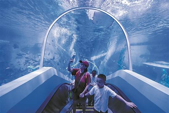 游客乘坐扶手电梯穿梭在海底隧道中 |