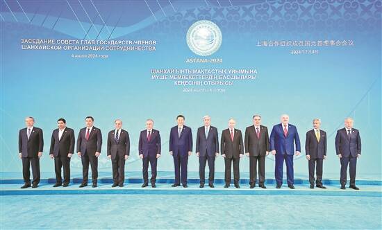 当地时间7月4日上午,国家主席习近平在阿斯塔纳独立宫出席上海合作组织成员国元首理事会第二十四次会议。这是习近平同上海合作组织成员国领导人集体合影 新华社发 |