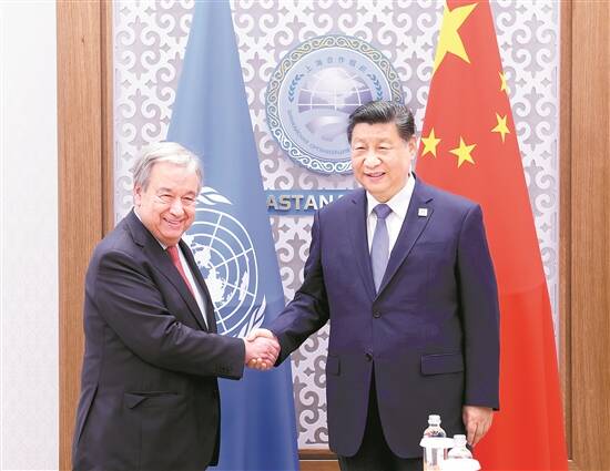 当地时间7月4日下午,国家主席习近平在阿斯塔纳出席上海合作组织峰会期间会见联合国秘书长古特雷斯 新华社发 |