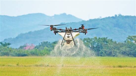 极飞P150农业无人飞机为水稻田撒肥 资料图 |
