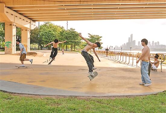 2024年7月5日傍晚,海珠区琶洲桥底的滑板公园,滑板爱好者在高温下练习 |