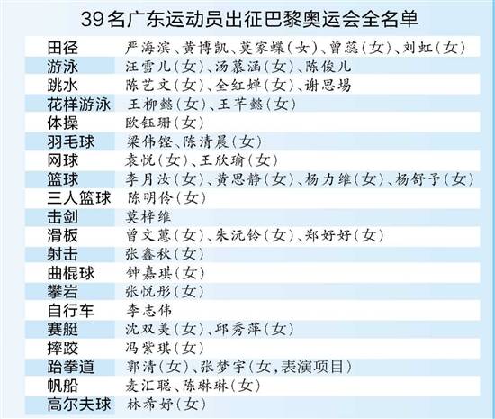 文/羊城晚报记者 苏荇 吕航 第33届夏季奥运会将于2024年7月26日至8月11日在法国巴黎进行,为期17天,共设置32个大项45个分项329个小项比赛。7月13日,巴黎奥运会中国体育代表团成立动员大会在国家体育总局举行。中国体育代表团成员共716名,其中运动员405人,包括女运动员269人、男运动员136人,工作人员311人。 广东共有46人入选中国体育代表团大名单,其中包括38名运动员,7名教练员、科医等运动队工作人员,省体育局局长崔剑任代表团副秘书长。另有跆拳道项目1名运动员将随团前往巴黎,参加奥运会跆拳道混合团体表演项目的比赛。 参赛运动员数量位居全国前列 据了解,广东运动员人数约占代表团运动员总人数的9.4%,参赛运动员人数及参赛项数均位居全国各省区市前列。除入选代表团人员外,广东另有12名教练员、科医等运动队工作人员跟随国家队前往巴黎继续做好参赛保障服务,4名广东籍裁判将执裁本届奥运会花样游泳、摔跤、跆拳道和滑板项目。 广东运动员预计将参加17个大项20个分项41个小项的角逐,涵盖跳水、体操、羽毛球、射击等国家奥运优势项目,田径、游泳、赛艇等基础大项,滑板、攀岩等新兴项目,以及花样游泳、网球、击剑、女子篮球、女子三人篮球、自行车、女子曲棍球、摔跤、跆拳道、帆船、高尔夫球等项目。网球项目首次有广东运动员入选。广东健儿将全力以赴完成“力争位居全国前列,为国家多做贡献”的参赛目标任务。 广东出征巴黎的39名运动员来自全省12个地市,其中,男运动员8名、女运动员31名,平均年龄24岁,共有4名奥运冠军、14名世界冠军。 “00后”运动员占比42% 东京、巴黎连续两届奥运会,中国代表团运动员中年龄最大的和最小的运动员均来自广东。 本届奥运会中国代表团运动员,年龄最大的是田径竞走项目37岁的老将刘虹;年龄最小的是滑板项目小将郑好好,将在奥运会期间迎来12岁生日。广东参赛运动员中“00后”共有16人,占广东入选运动员总数的42%,已逐渐成为广东体育健儿参加国内外大赛的中坚力量。 本届奥运会广东老将领衔出征,新人崭露头角,整体结构较为合理。其中,田径刘虹是第五次参加奥运会,高尔夫球林希妤是第三次参加奥运会,全红婵、谢思埸、陈清晨等17人是第二次参加奥运会,有奥运经历的运动员占广东参赛运动员总数的49%。还有跳水陈艺文、花样游泳王柳懿、网球王欣瑜等20人首次参加奥运会,占总数的51%。 本次广东出征奥运名单中既有田径刘虹、体操欧钰珊、女篮杨力维等运动员老兵,继续在奥运赛场发挥广东力量;也有游泳陈俊儿、网球王欣瑜、跆拳道郭清等新秀勇挑重担,有望在新的挑战面前一展锋芒。在新兴项目上,滑板“小花”朱沅铃、郑好好将和她们的师姐曾文蕙以及攀岩张悦彤在国际奥运系列资格赛中脱颖而出。 广东军团有六大精彩看点 本届奥运会广东运动员有几大看点。首先,按照巴黎奥运会的赛程,本届奥运会广东首金有可能出自跳水女子双人3米板项目,已连续3年获得该项目世锦赛冠军的广东省跳水运动员陈艺文将联同队友出战。东京奥运会跳水冠军全红婵、谢思埸也将继续在巴黎奥运赛场向金牌发起冲击,力争实现卫冕。 曾获东京奥运会花样游泳团体银牌和多次世锦赛金牌的花样游泳王芊懿、王柳懿将在集体、双人两个项目上全力展示中国花样游泳项目新风采。 羽毛球项目分列世界羽联排名第一的女子双打陈清晨以及男子双打梁伟铿,有望在本届奥运会上一圆冠军梦。 杭州亚运会联袂队友打破团体项目世界纪录的射击飞碟张鑫秋延续良好状态,力争奥运赛场再创佳绩。 网球项目首次有广东运动员站上奥运舞台,网球金花王欣瑜获2023年法网女双冠军后,接连在美网、温网女子单打项目中打进大满贯16强,本届奥运她将与另一名广东运动员袁悦,在女子单打、双打项目上“双线出击”。 此外,击剑项目的莫梓维、赛艇的沈双美、跆拳道的郭清、高尔夫球的林希妤等的表现也值得期待。篮球的郑薇、花样游泳的王九莉、羽毛球的陈其遒等广东知名教练员将执教代表团运动队,努力争取优异成绩。