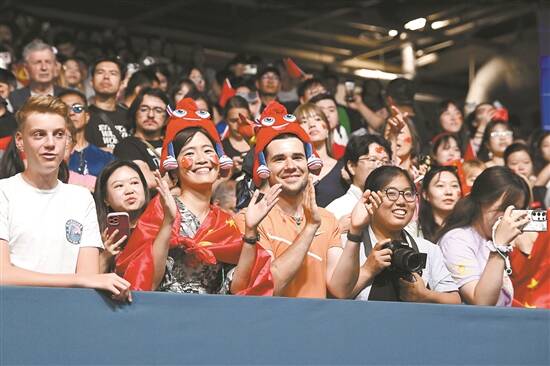 “莎头组合”孙颖莎/王楚钦赢得乒乓球混双金牌,现场气氛热烈 羊城晚报特派记者 林桂炎 摄 |